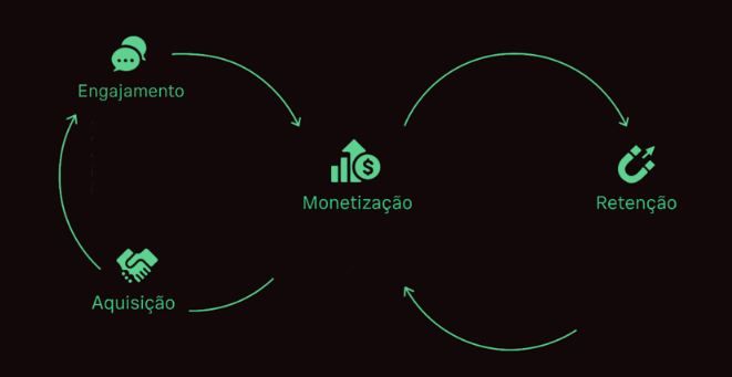 O Método MARVE se apoia em um ciclo vivo e escalável, formado por quatro motores de crescimento: Aquisição, Engajamento, Monetização e Retenção.